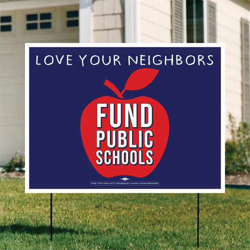Yard signs, tote bags, shirts, buttons